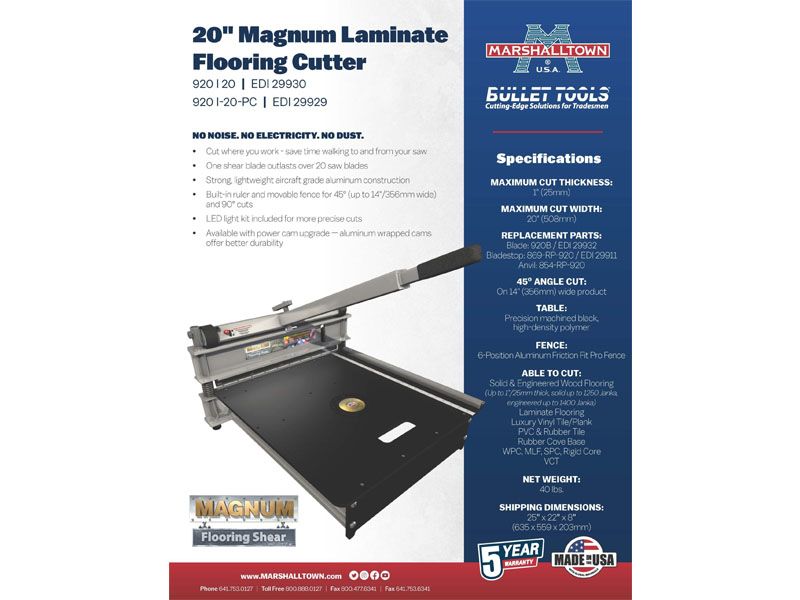 Der Bullet by Marshalltown Magnum-Bodenbelagsschneider zeichnet sich durch ihre Qualität, Handwerkskunst und Robustheit aus. Mit ihren verbesserten Profilen, hochbelastbaren Stahlkugellagern, dem verstärkten Tisch, der LED-Beleuchtung und der hochwertigen Klinge ist dieses Werkzeug ein Muss fĂĽr ernsthafte Bodenbelagsprofis. Wählen Sie Ihre bevorzugte Scherenblattlänge zwischen 9″, 20″ oder 26″. Jede Option verfĂĽgt ĂĽber ein eingebautes Lineal fĂĽr genaue Messungen während der Arbeit und einen beweglichen Anschlag fĂĽr 45-Grad-Schnitte. Unsere FuĂźbodenschneider haben eine starke, leichte Konstruktion aus Flugzeugaluminium fĂĽr den einfachen Transport auf der Baustelle, damit Sie dort schneiden können, wo Sie arbeiten. Diese Produkte werden in den USA mit globalen Materialien hergestellt und werden mit einer 5-Jahres-Garantie geliefert. Ein unentbehrlicher, hochbelastbarer Fugenschneider fĂĽr professionelle Bauunternehmer Schneidet dort, wo Sie arbeiten, ohne Lärm, Staub oder Strom Schneidet Materialien bis zu einer Dicke von 1″; Schnittbreite abhängig von der Wahl der Schere 20″ & 26″ Schere kann Massivholz (1250 Janka), Hartholz (1400 Janka), Laminat, LVP, LVT, PVC & Gummifliesen, Gummiunterlage, WPC, MLF, SPC, Hartkern und VCT schneiden Die 9-Zoll-Magnum-Kantenschere kann Hartholzböden (bis zu einer Stärke von 1″, 4000 Janka), einschlieĂźlich Bambusböden, Parkett, Laminat, WPC und Vinylplanken schneiden Beweglicher Anschlag ermöglicht 90- und 45-Grad-Winkelschnitte Eingebautes Lineal und LED-Beleuchtung fĂĽr mehr Präzision beim Schneiden Stabile, leichte Konstruktion aus Flugzeugaluminium Metallummantelte „Power-Cam“-Kugellager 5 Jahre Garantie