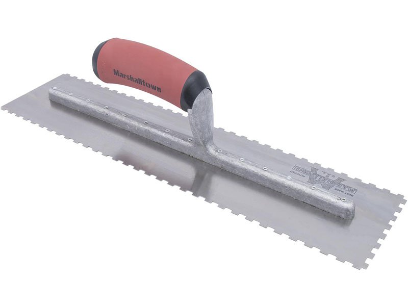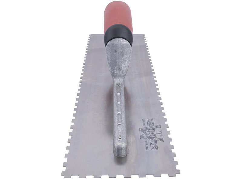 Die dreiseitig gezahnte Kelle von Marshalltown für präzises Auftragen von Klebstoffen und Fliesenkleber. Robustes Design mit Durasoft Griff für Komfort. Blattgröße: 279×114 mm, Eckige Zahnung 6x3x6 mm.