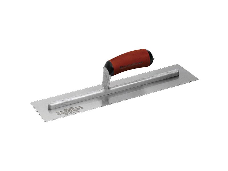Die dreiseitig gezahnte Kelle von Marshalltown für präzises Auftragen von Klebstoffen und Fliesenkleber. Robustes Design mit Durasoft Griff für Komfort. Blattgröße: 279×114 mm, V-Zahnung 3x3x1,5 mm.