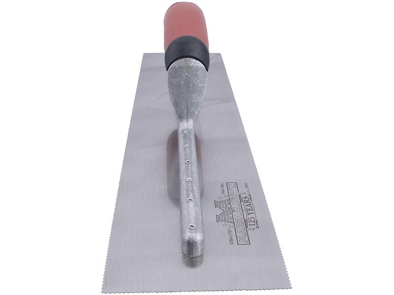Die dreiseitig gezahnte Kelle von Marshalltown für präzises Auftragen von Klebstoffen und Fliesenkleber. Robustes Design mit Durasoft Griff für Komfort. Blattgröße: 279×114 mm, U-Zahnung 1,5×0,75×0,75 mm.