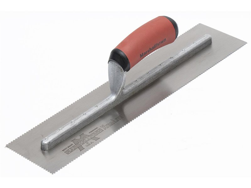 Die dreiseitig gezahnte Kelle von Marshalltown für präzises Auftragen von Klebstoffen und Fliesenkleber. Robustes Design mit Durasoft Griff für Komfort. Blattgröße: 279×114 mm, U-Zahnung 1,5×1,5×2,5 mm.