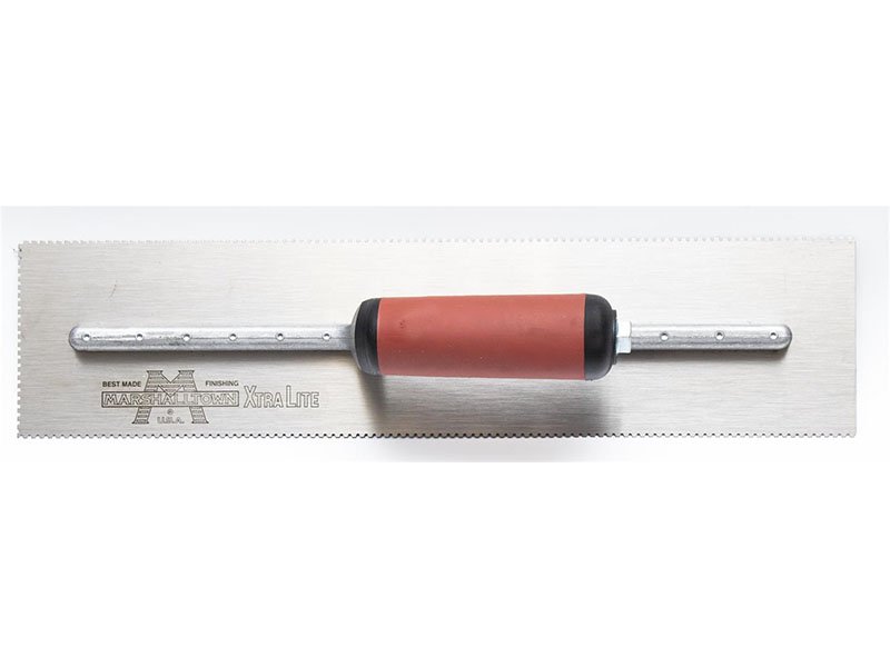 Die gezahnte Kelle von Marshalltown wird zum Verlegen von Fliesen, Teppichen und anderen Bodenbelägen, die mit Klebstoff oder Fliesenkleber bestrichen werden, verwendet. Durch die Zahnung und Größe der Kerben kann man die Menge des aufgetragenen Klebstoffs kontrollieren. Die Halterung aus Aluminiumguss ist fest vernietet an einem Blatt aus gehärtetem Stahl. Der widerstandsfähige Durasoft Griff bietet ein weiches Gefühl, mindert Ermüdungserscheinungen und bietet eine ausgezeichnete Haltbarkeit. Bei dieser Kelle sind drei Seiten der Kelle gezahnt und eine glatt und die Blattgrösse ist 279×114 mm.