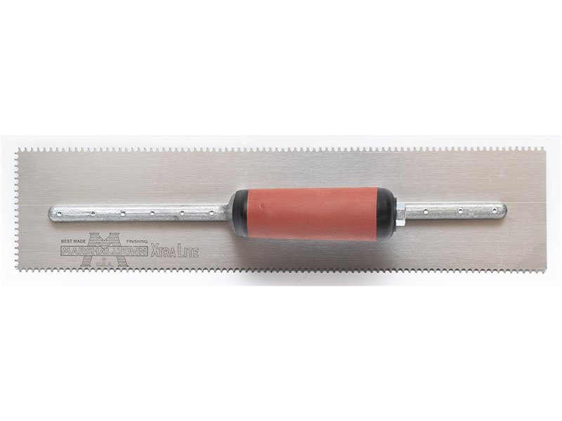 Die gezahnte Kelle von Marshalltown wird zum Verlegen von Fliesen, Teppichen und anderen Bodenbelägen, die mit Klebstoff oder Fliesenkleber bestrichen werden, verwendet. Durch die Zahnung und Größe der Kerben kann man die Menge des aufgetragenen Klebstoffs kontrollieren. Die Halterung aus Aluminiumguss ist fest vernietet an einem Blatt aus gehärtetem Stahl. Der widerstandsfähige Durasoft Griff bietet ein weiches Gefühl, mindert Ermüdungserscheinungen und bietet eine ausgezeichnete Haltbarkeit. Bei dieser Kelle sind drei Seiten der Kelle gezahnt und eine glatt und die Blattgrösse ist 279×114 mm.