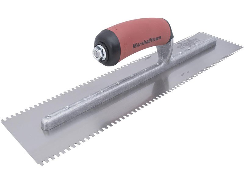 Die dreiseitig gezahnte Kelle von Marshalltown für präzises Auftragen von Klebstoffen und Fliesenkleber. Robustes Design mit Durasoft Griff für Komfort. Blattgröße: 279×114 mm, U-Zahnung 3×4,5×3 mm.