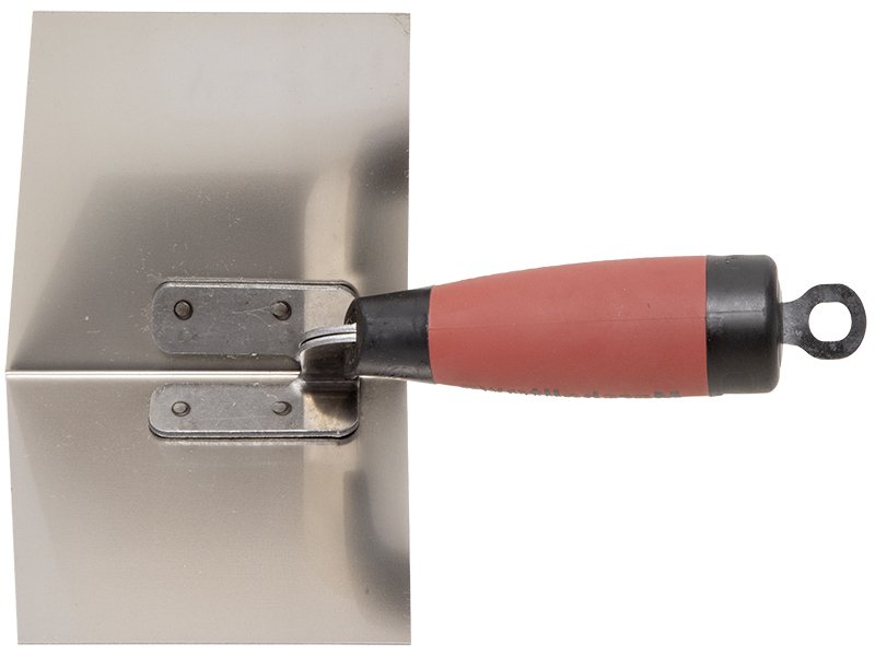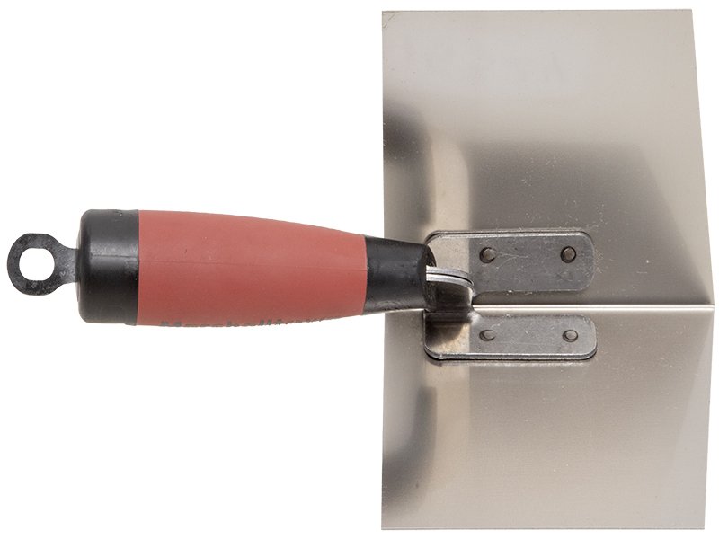 Die leichte Inneneck-Kelle von Marshalltown aus flexiblem Edelstahl bildet perfekte 90-Grad-Ecken. Haltbar, einfach zu reinigen und ideal für Trockenbauer und Verputzer. Maße: 127×95 mm