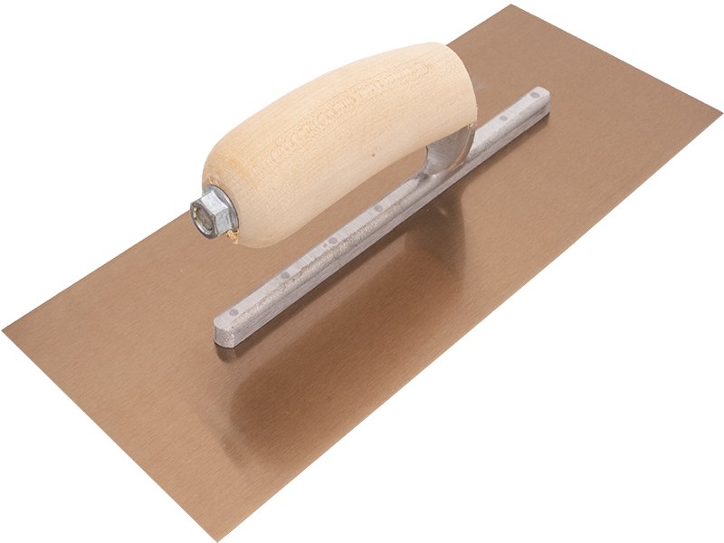 Die DuraFlex Glättkelle von Marshalltown: Flaches, flexibles Blatt für gleichmäßiges Finish. Festes Goldstahlblatt mit Vierkant Schaft. Holzgriff. Austauschbarer Griff (Durasoft, Holz, Leder). Maße: 356×127 mm.
