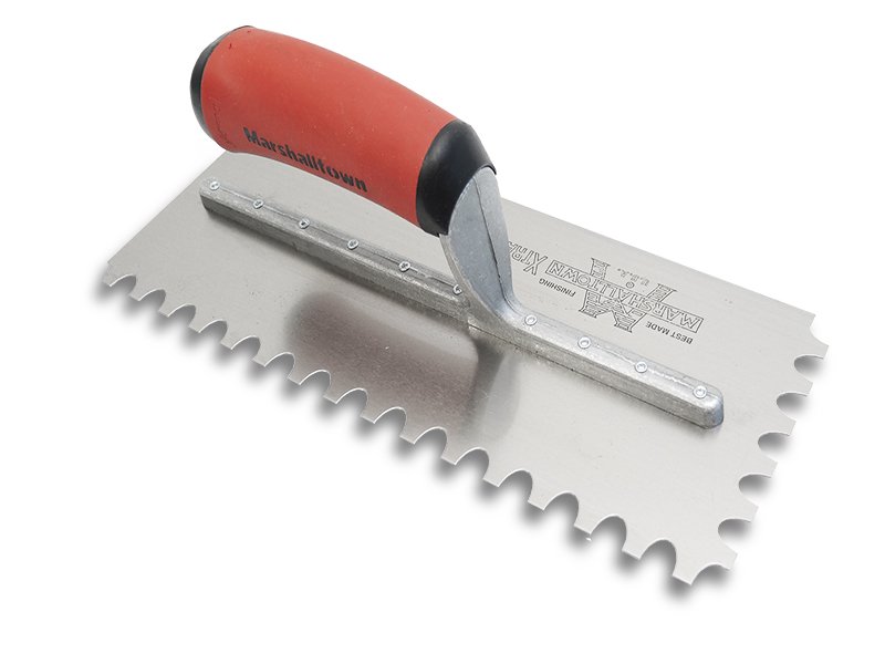 Die gezahnte Kelle von Marshalltown wird zum Verlegen von Fliesen, Teppichen und anderen Bodenbelägen, die mit Klebstoff oder Fliesenkleber bestrichen werden, verwendet. Durch die Zahnung und Größe der Kerben kann man die Menge des aufgetragenen Klebstoffs kontrollieren. Die Halterung aus Aluminiumguss ist fest vernietet an einem Blatt aus gehärtetem Stahl. Der widerstandsfähige Durasoft Griff bietet ein weiches Gefühl, mindert Ermüdungserscheinungen und bietet eine ausgezeichnete Haltbarkeit. Bei dieser Kelle sind zwei Seiten der Kelle gezahnt und zwei glatt und die Blattgrösse ist 279×114 mm.