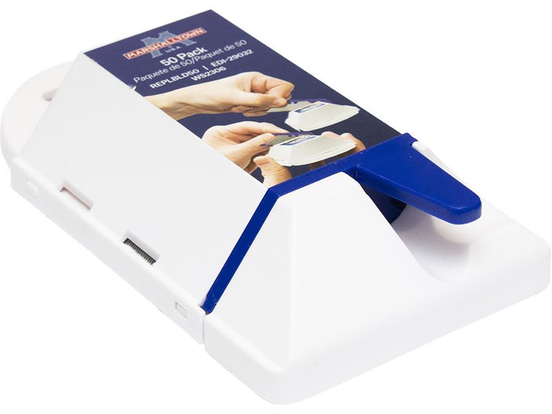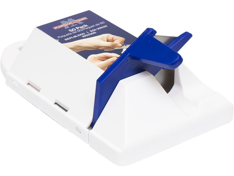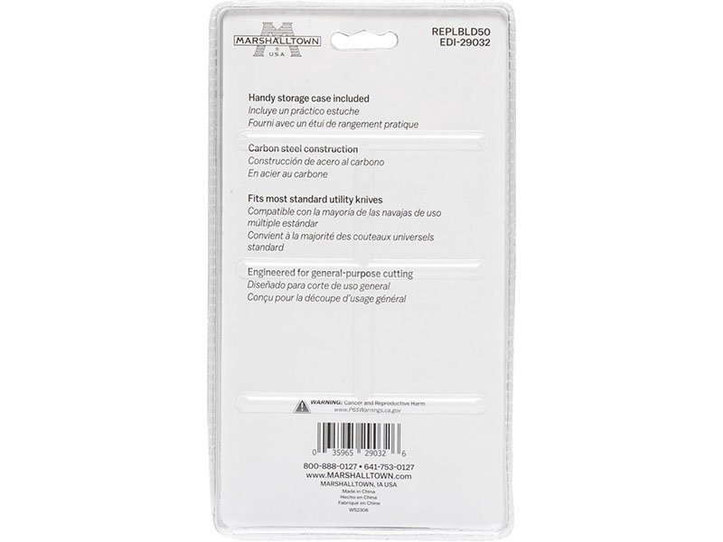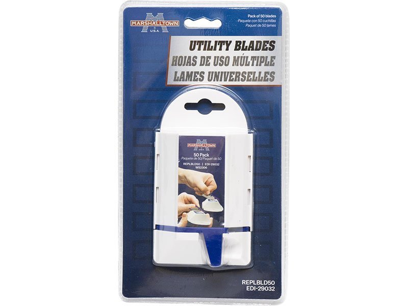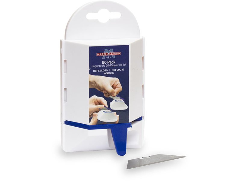 Die Ersatzklingen von Marshalltown sind aus robustem Carbonstahl. Sie sind für alle gängige Schneidemesser passend. Die Klingen werden in einer Aufbewahrungsbox geliefert, die man aufhängen kann und die Klingen einzeln, sicher entnehmen kann. In der Box sind 50 Stück.