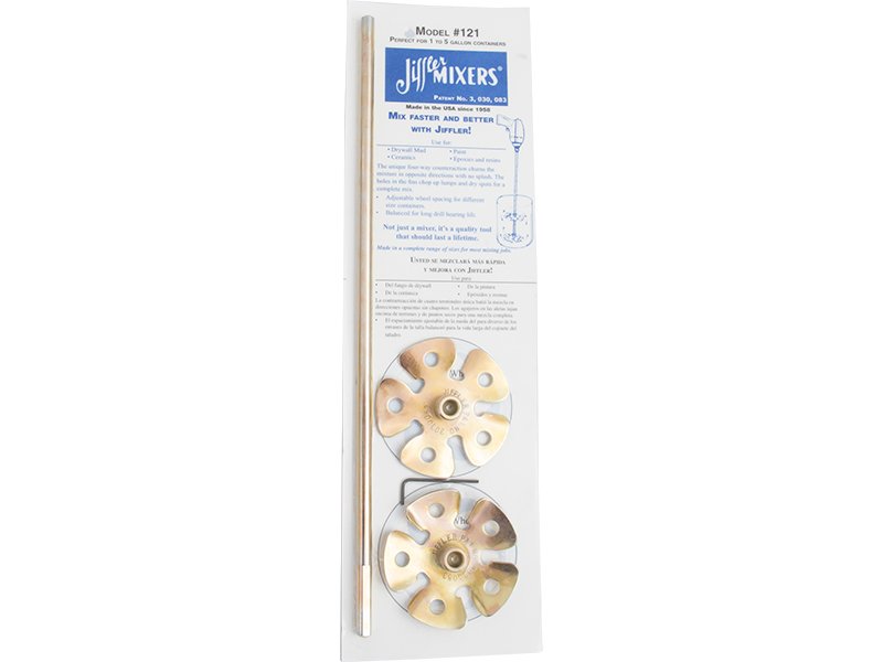 Der Marshalltown Jiffler Mixer verfügt über zwei 89 mm Lüfterräder, die aus beschichtetem Stahl sind. Das untere Rad schneidet nach oben, während das obere Rad nach unten schneidet, um einen Gegenstrom durch das Material zu erzeugen. Er eignet sich perfekt für alle Trockenbauer, um ihr Material zu mischen. Der 9,4 mm dicke, plattierte Stahlstiel ist für ein 6 mm oder größeres Bohrfutter auf einer tragbaren oder stationären Bohrmaschine mit mindestens 1.000 U/min gefräst worden.