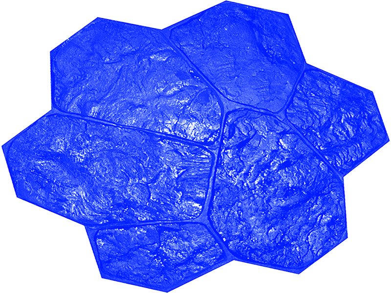Marshalltown Betonstempel „Fieldstone „: Harte Kunststoffkonstruktion, Stempel hat ein natürliches Aussehen von Feldsteinen, die zufällig zusammenarrangiert wurden, 6-13 mm tiefe Fugenlinien, blau und flexibel. Maße: 813×813 mm.