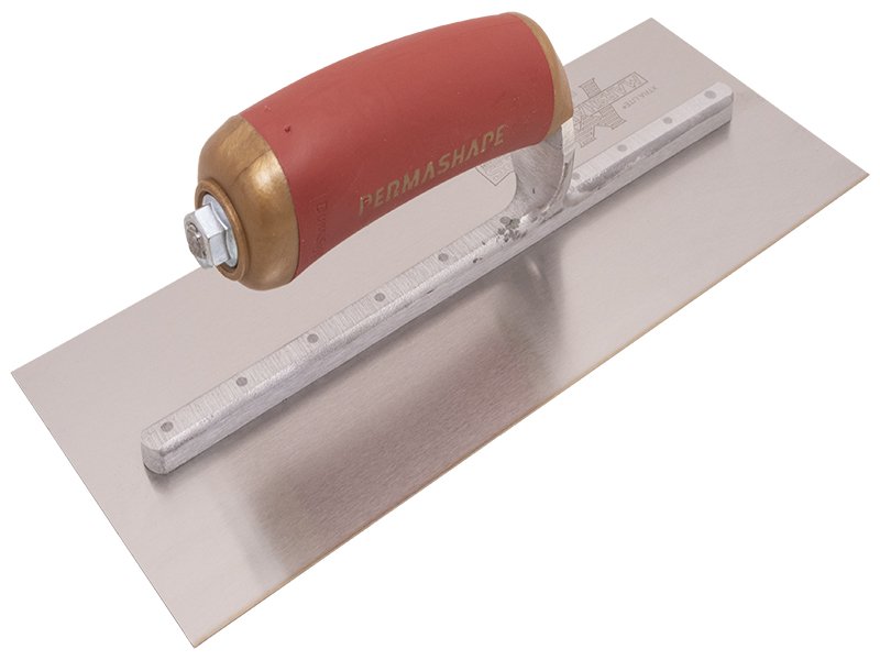 Dieser Marshalltown PermaShape Glättkelle ist aus geschliffenem und gehärtetem Goldstahl von höchster Qualität gefertigt. Viele Handwerker lieben auch die flache Form. Die Halterung aus einer Aluminiumlegierung ist wärmebehandelt, auf Festigkeit geprüft und maschinell gefertigt, um einen idealen Balance zwischen Halterung und Griff zu gewährleisten. Diese Glättekelle ist leicht, aber extrem stark. Die gehärteten Stahlnieten, die die Halterung an der Klinge halten, sind richtig dimensioniert und für zusätzliche Festigkeit immer an der ersten Niete grösser, da dort die größte Belastung an der Glättkelle ist. Der gebogene patentierte Durasoft Griff ist sicher an die Halterung/Stütze angebracht. Er vermindert durch seine ergonomische Form Ermüdungserscheinungen und bietet einen verbesserten Komfort beim Arbeiten. Das ermöglicht dem Handwerker den ganzen Tag zu arbeiten, ohne das seine Hände schmerzen.
