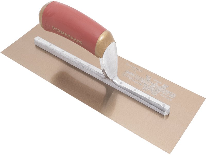 Marshalltown PermaShape Glättkelle: Hochwertiger Goldstahl, flache Form, wärmebehandelte Aluminiumlegierung, leicht und stark, gehärtete Stahlnieten, Durasoftgriff, austauschbar. Maße: 279×114 mm.