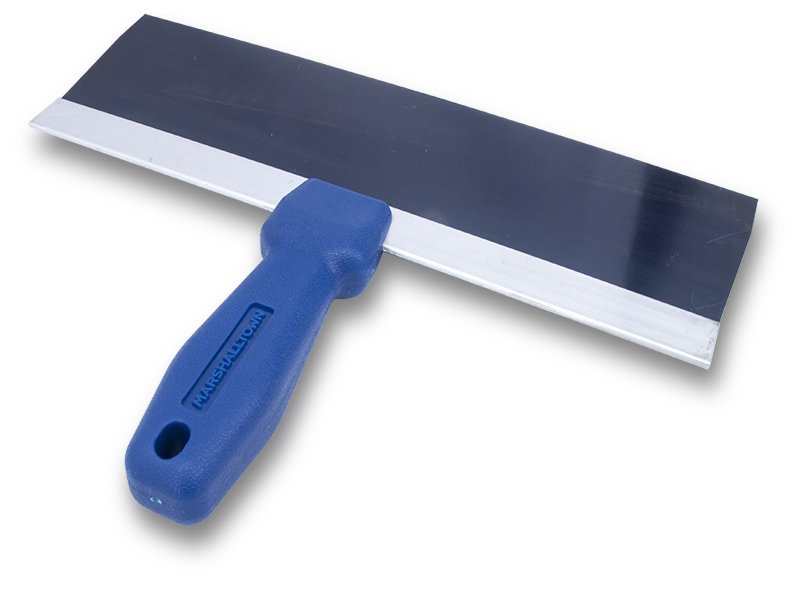 Der Flächenspachtel von Marshalltown hat ein hochwertiges, gehärtetes Blatt aus Blaustahl, dass mit einer Aluminium-Trägerplatte verbunden ist. Durch die Vernietung des Spachtels mit der Trägerplatte ist sichergestellt, dass der Griff sich auch nach starker Beanspruchung nicht löst. Durch die schmale Form ist das Auftragen der Spachtelmasse noch leichter. Der Flächenspachtel ist ein perfektes Mehrzweckwerkzeug, denn er kann zum Auftragen von Wandkitt benutzt werden, sowie auch zum Füllen von Trockenbaufugen und zum Abschaben von Oberflächen. Er hat ein konisches Blatt, das hervorragend für Eckarbeiten ist. Der Kunststoffgriff ist leicht zu reinigen und belastbar.
