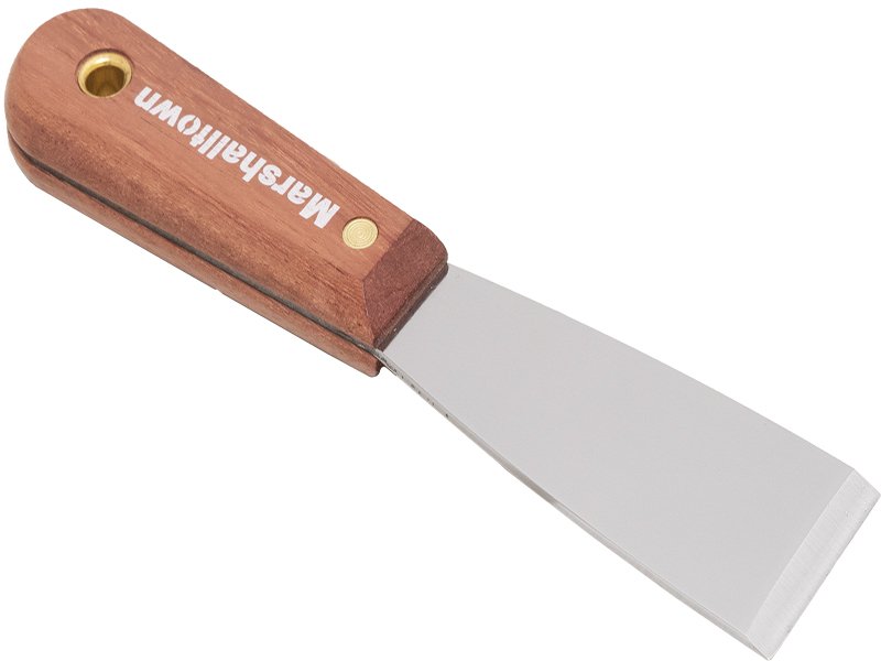 Vielseitiger Marshalltown Fugenspachtel aus flexiblem Stahl für Spachteln, Abschaben, Tapeten entfernen und mehr. Durchgehendes Blatt bis in den Griff. Aufhängeloch für einfache Aufbewahrung. Widerstandsfähiger Palisanderholzgriff. Maße: 184×38 mm.