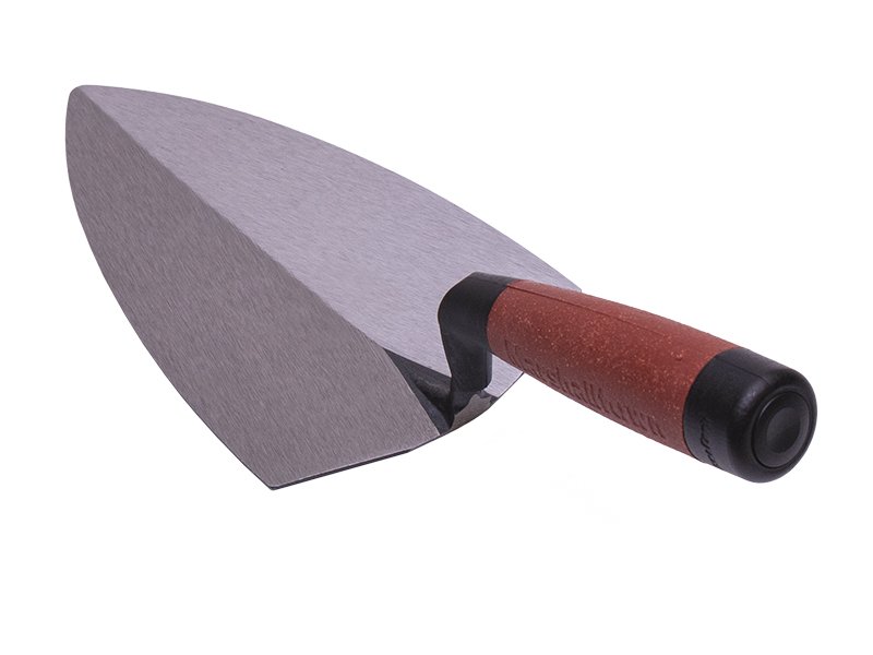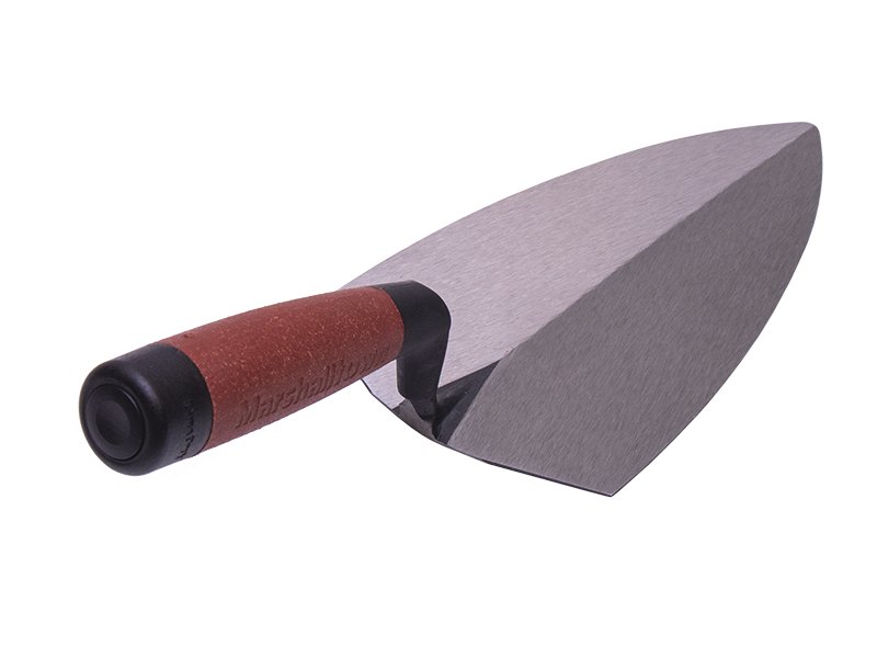 Die Fliesenlegerkelle von Marshalltown: Geschmiedet aus hochwertigem Carbonstahl, breites Blatt für schnelles Arbeiten, konisch geschliffen und poliert. Langlebiger DuraKork Griff.