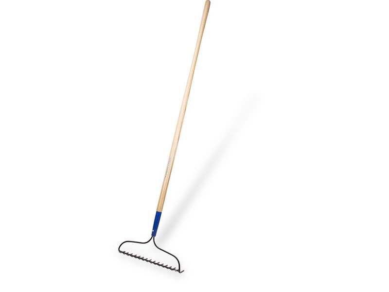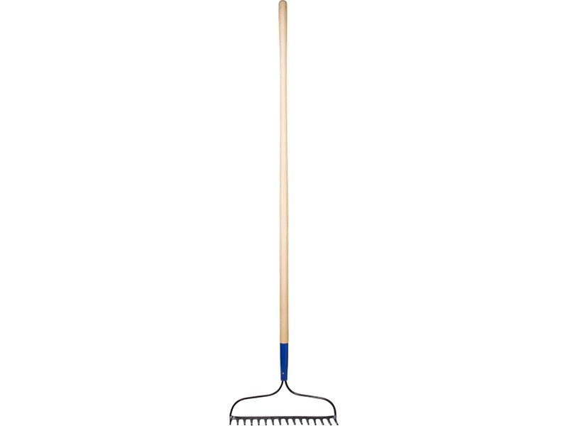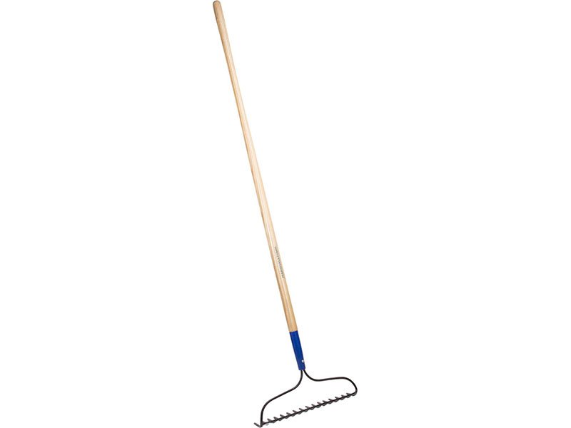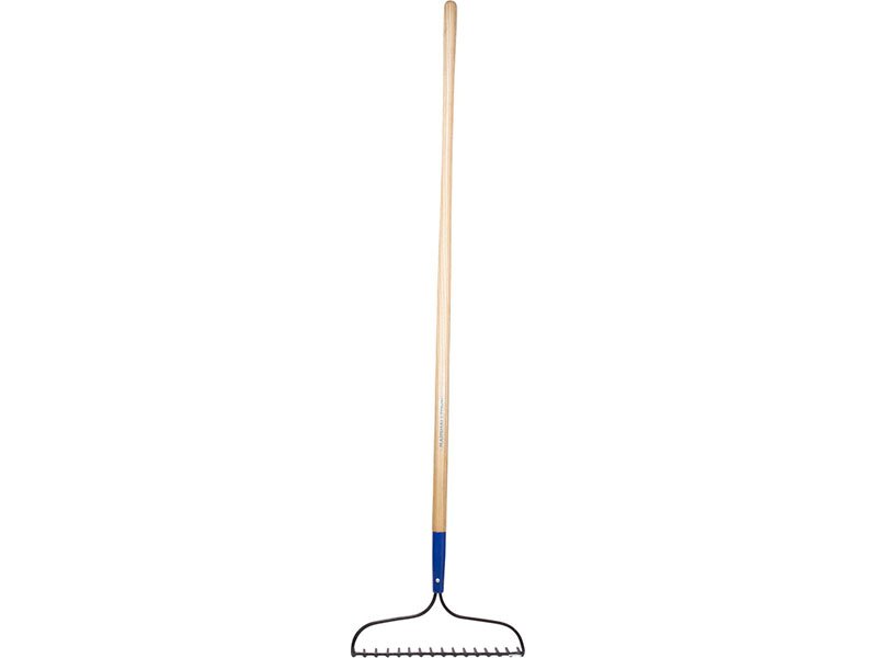 Marshalltown gebogener Gartenrechen: Einteiliger, geschmiedeter Stahlkopf für Stärke und Haltbarkeit. Eschenstiel mit roter Stahlzwinge. 1524 mm Stiellänge, 16 Zähne mit 95 mm Länge.