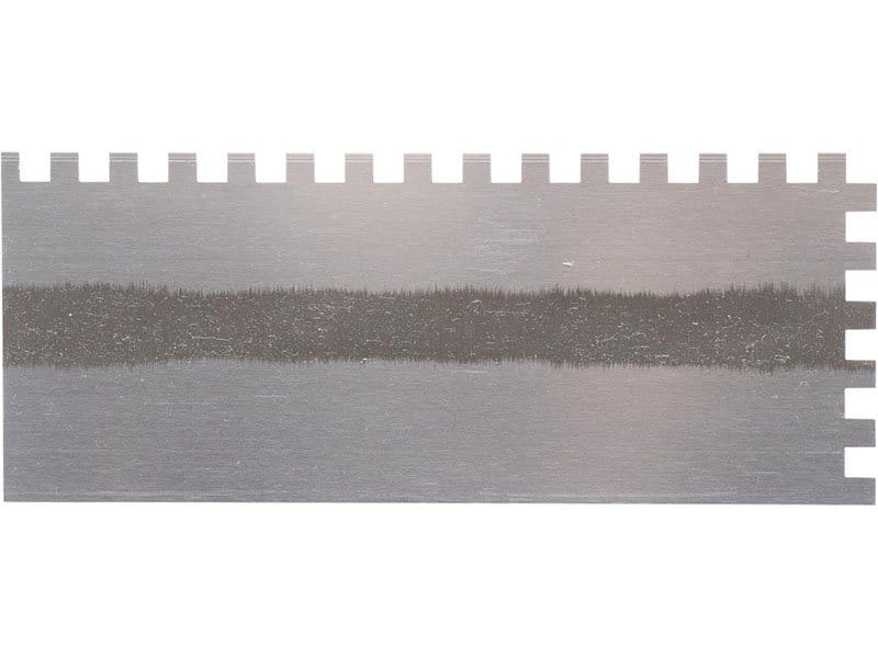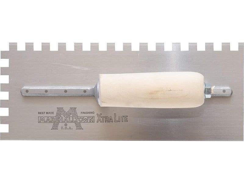 Die gezahnte Kelle von Marshalltown wird zum Verlegen von Fliesen, Teppichen und anderen Bodenbelägen, die mit Klebstoff oder Fliesenkleber bestrichen werden, verwendet. Durch die Zahnung und Größe der Kerben kann man die Menge des aufgetragenen Klebstoffs kontrollieren. Die Halterung aus Aluminiumguss ist fest vernietet an einem Blatt aus gehärtetem Stahl. Der Holzgriff bietet guten Komfort beim Arbeiten und ist pflegeleicht. Bei dieser Kelle sind zwei Seiten der Kelle gezahnt und zwei glatt und die Blattgrösse ist 279×114 mm.