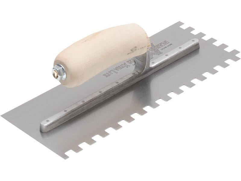 Marshalltown WDVS-Kellen: Leichte Aluminiumlegierung, Carbonstahlblatt, mühelose Verteilung von Mörtel/Kleber, glatte WDVS-Verkleidung, pflegeleichter Holzgriff. Eckige Kerbung 10x10x10 mm.
