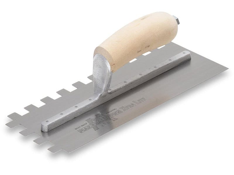 Die gezahnte Kelle von Marshalltown wird zum Verlegen von Fliesen, Teppichen und anderen Bodenbelägen, die mit Klebstoff oder Fliesenkleber bestrichen werden, verwendet. Durch die Zahnung und Größe der Kerben kann man die Menge des aufgetragenen Klebstoffs kontrollieren. Die Halterung aus Aluminiumguss ist fest vernietet an einem Blatt aus gehärtetem Stahl. Der Holzgriff bietet guten Komfort beim Arbeiten und ist pflegeleicht. Bei dieser Kelle sind zwei Seiten der Kelle gezahnt und zwei glatt und die Blattgrösse ist 279×114 mm.