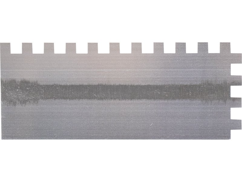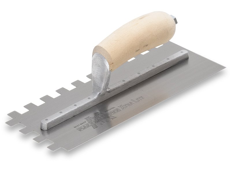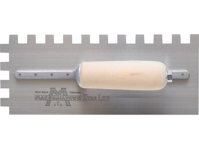 Die gezahnte Kelle von Marshalltown wird zum Verlegen von Fliesen, Teppichen und anderen Bodenbelägen, die mit Klebstoff oder Fliesenkleber bestrichen werden, verwendet. Durch die Zahnung und Größe der Kerben kann man die Menge des aufgetragenen Klebstoffs kontrollieren. Die Halterung aus Aluminiumguss ist fest vernietet an einem Blatt aus gehärtetem Stahl. Der Holzgriff bietet guten Komfort beim Arbeiten und ist pflegeleicht. Bei dieser Kelle sind zwei Seiten der Kelle gezahnt und zwei glatt und die Blattgrösse ist 279×114 mm.