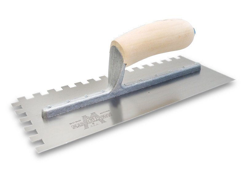 Die gezahnte Kelle von Marshalltown ermöglicht präzises Auftragen von Klebstoff für Fliesen und Bodenbeläge. Aluminiumguss-Halterung, gehärtetes Stahlblatt und robuster, gebogener Holzgriff. Größe: 279×114 mm, Eckig 4,5x3x4,5 mm.