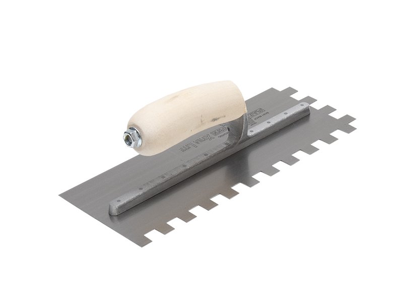 Die gezahnte Kelle von Marshalltown wird zum Verlegen von Fliesen, Teppichen und anderen Bodenbelägen, die mit Klebstoff oder Fliesenkleber bestrichen werden, verwendet. Durch die Zahnung und Größe der Kerben kann man die Menge des aufgetragenen Klebstoffs kontrollieren. Die Halterung aus Aluminiumguss ist fest vernietet an einem Blatt aus gehärtetem Stahl. Der Holzgriff bietet guten Komfort beim Arbeiten und ist pflegeleicht. Bei dieser Kelle sind zwei Seiten der Kelle gezahnt und zwei glatt und die Blattgrösse ist 279×114 mm.