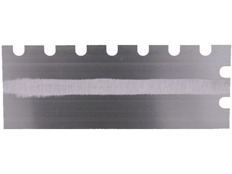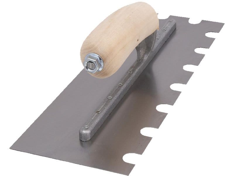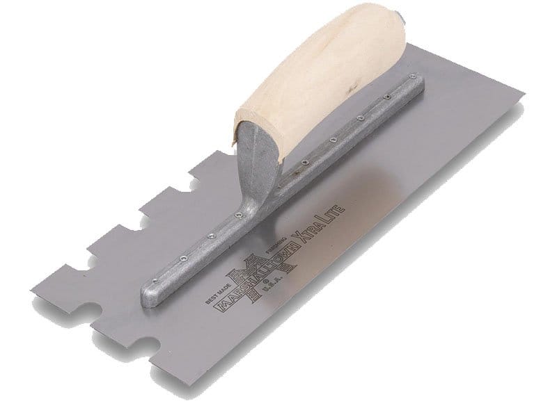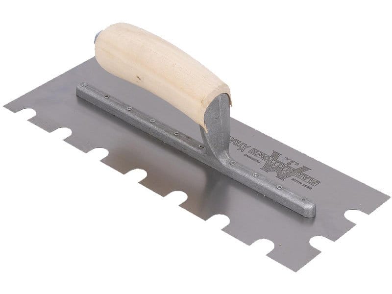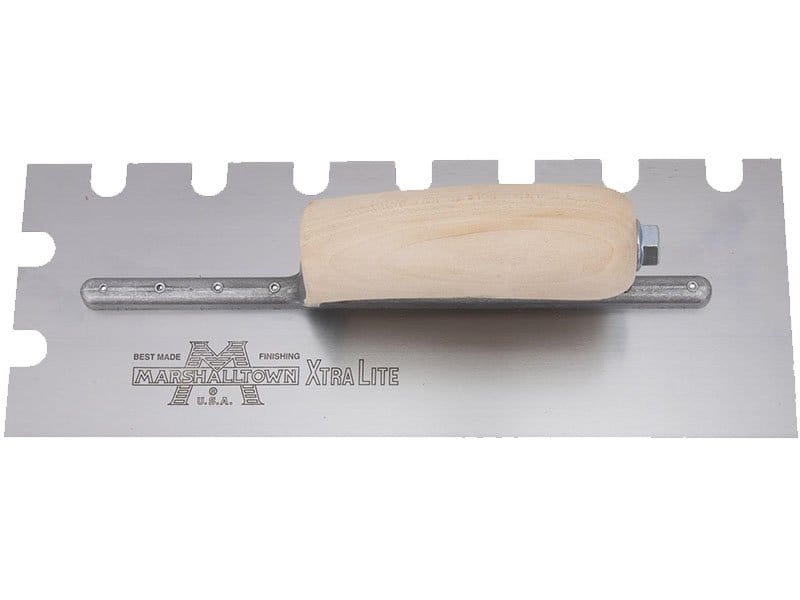 Die gezahnte Kelle von Marshalltown wird zum Verlegen von Fliesen, Teppichen und anderen Bodenbelägen, die mit Klebstoff oder Fliesenkleber bestrichen werden, verwendet. Durch die Zahnung und Größe der Kerben kann man die Menge des aufgetragenen Klebstoffs kontrollieren. Die Halterung aus Aluminiumguss ist fest vernietet an einem Blatt aus gehärtetem Carbonstahl. Der Holzgriff bietet guten Komfort beim Arbeiten und ist pflegeleicht. Bei dieser Kelle sind zwei Seiten der Kelle gezahnt und zwei glatt und die Blattgrösse ist 305×102 mm.