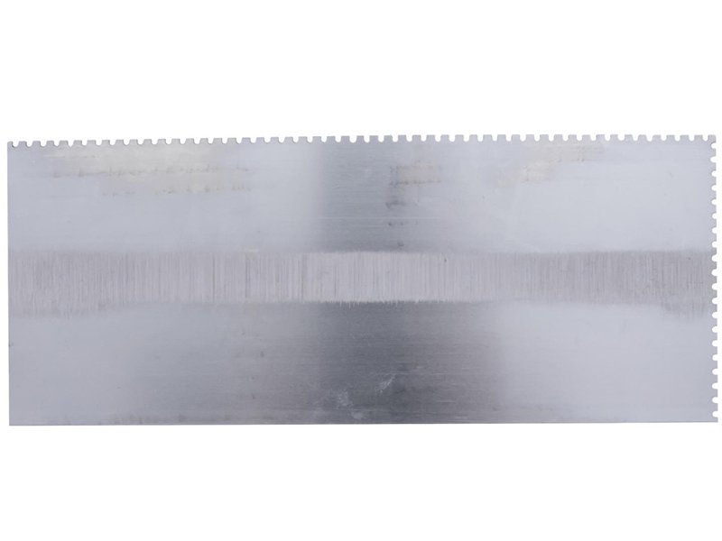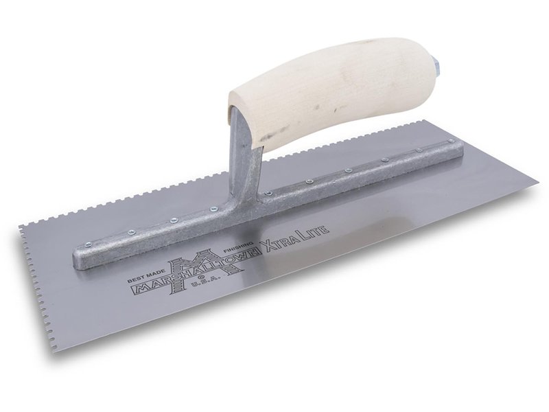 Die gezahnte Kelle von Marshalltown wird zum Verlegen von Fliesen, Teppichen und anderen Bodenbelägen, die mit Klebstoff oder Fliesenkleber bestrichen werden, verwendet. Durch die Zahnung und Größe der Kerben kann man die Menge des aufgetragenen Klebstoffs kontrollieren. Die Halterung aus Aluminiumguss ist fest vernietet an einem Blatt aus gehärtetem Stahl. Der Holzgriff bietet guten Komfort beim Arbeiten und ist pflegeleicht. Bei dieser Kelle sind zwei Seiten der Kelle gezahnt und zwei glatt und die Blattgrösse ist 279×114 mm.