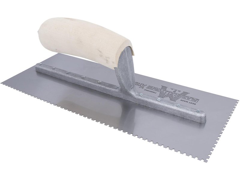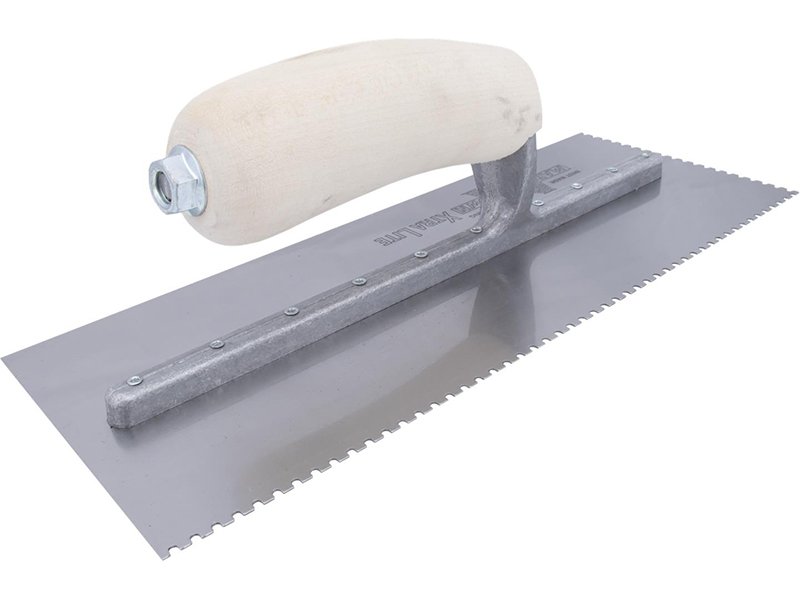Die gezahnte Kelle von Marshalltown ermöglicht präzises Auftragen von Klebstoff für Fliesen und Bodenbeläge. Aluminiumguss-Halterung, gehärtetes Stahlblatt und robuster, gebogener Holzgriff. Größe: 279×114 mm, U 2,5×2,5×3 mm.