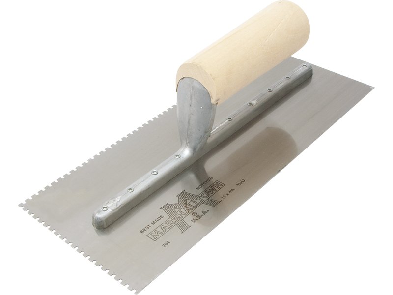 Die gezahnte Kelle von Marshalltown wird zum Verlegen von Fliesen, Teppichen und anderen Bodenbelägen, die mit Klebstoff oder Fliesenkleber bestrichen werden, verwendet. Durch die Zahnung und Größe der Kerben kann man die Menge des aufgetragenen Klebstoffs kontrollieren. Die Halterung aus Aluminiumguss ist fest vernietet an einem Blatt aus gehärtetem Stahl. Der Holzgriff bietet guten Komfort beim Arbeiten und ist pflegeleicht. Bei dieser Kelle sind zwei Seiten der Kelle gezahnt und zwei glatt und die Blattgrösse ist 279×114 mm.
