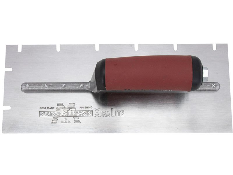 Die Marshalltown WDVS-Kellen sind für WDVS-Anwendungen unerlässlich. Die leichte Halterung aus einer Aluminiumlegierung ist mit einem Blatt aus Edelstahl vernietet. Die U-förmigen Kerben verteilen mühelos große Mengen an Mörtel oder Kleber und hinterlassen gleichmäßige Rillen für eine glatte WDVS-Verkleidung. Der patentierte Durasoft Griff liegt gut in der Hand und mindert Ermüdungserscheinungen beim Arbeiten.