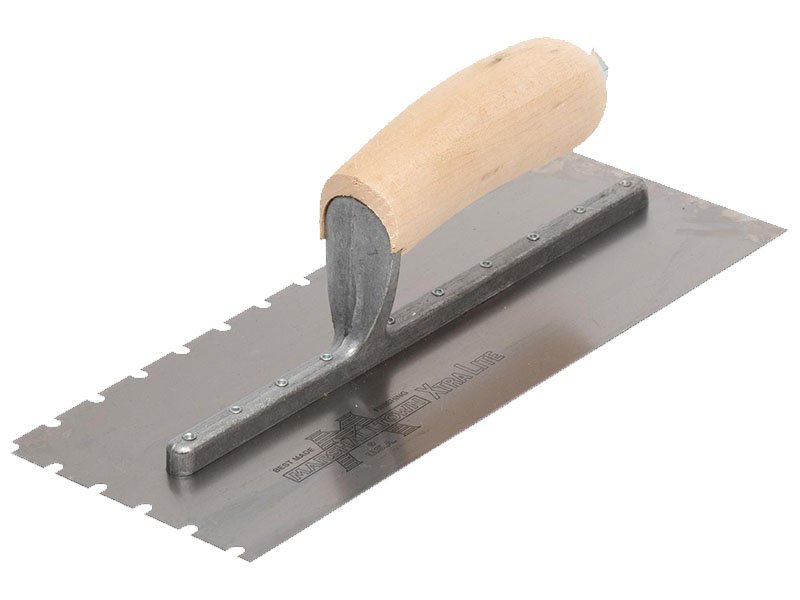 Marshalltown WDVS-Kellen: Leichte Aluminiumlegierung, Edelstahlblatt, mühelose Verteilung von Mörtel/Kleber, glatte WDVS-Verkleidung, pflegeleichter Holzgriff. U-Kerbung 4,5×4,5×6 mm.