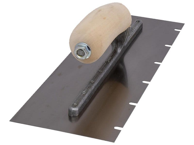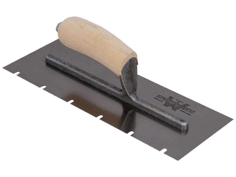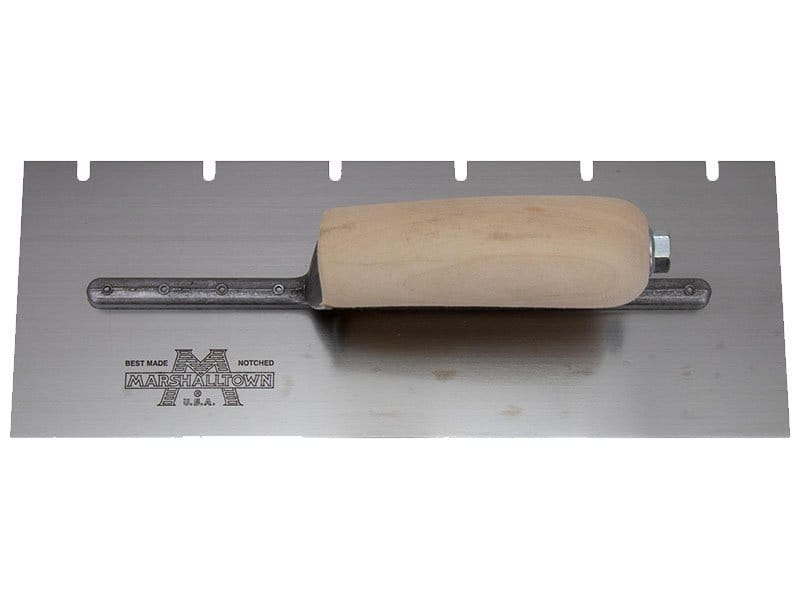 Die gezahnte Kelle von Marshalltown wird zum Verlegen von Fliesen, Teppichen und anderen Bodenbelägen, die mit Klebstoff oder Fliesenkleber bestrichen werden, verwendet. Durch die Zahnung und Größe der Kerben kann man die Menge des aufgetragenen Klebstoffs kontrollieren. Die Halterung aus Aluminiumguss ist fest vernietet an einem Blatt aus gehärtetem Carbonstahl. Der Holzgriff bietet guten Komfort beim Arbeiten und ist pflegeleicht. Bei dieser Kelle sind zwei Seiten der Kelle gezahnt und zwei glatt und die Blattgrösse ist 305×102 mm.