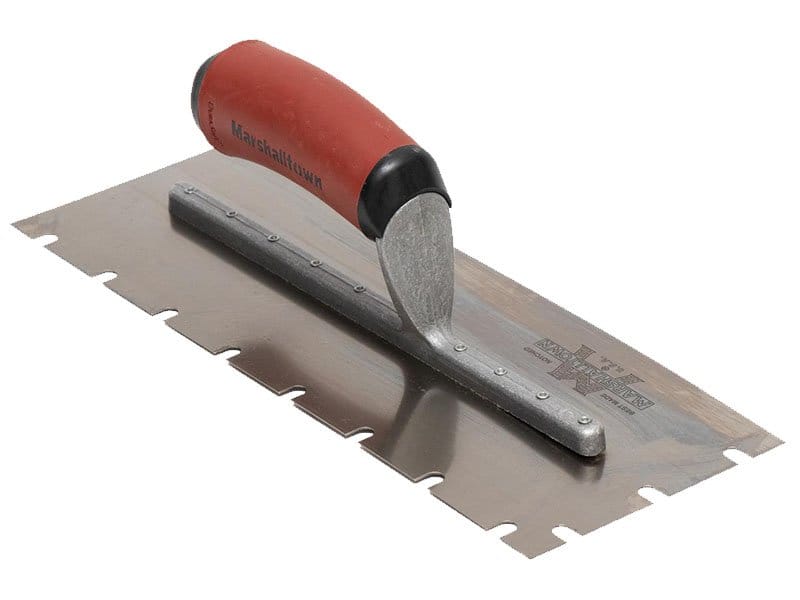 Die gezahnte Kelle von Marshalltown wird zum Verlegen von Fliesen, Teppichen und anderen Bodenbelägen, die mit Klebstoff oder Fliesenkleber bestrichen werden, verwendet. Durch die Zahnung und Größe der Kerben kann man die Menge des aufgetragenen Klebstoffs kontrollieren. Die Halterung aus Aluminiumguss ist fest vernietet an einem Blatt aus gehärtetem Carbonstahl. Der widerstandsfähige Durasoft Griff bietet ein weiches Gefühl, mindert Ermüdungserscheinungen und bietet eine ausgezeichnete Haltbarkeit. Bei dieser Kelle sind zwei Seiten der Kelle gezahnt und zwei glatt und die Blattgrösse ist 305×102 mm.