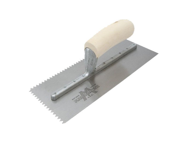 Die gezahnte Kelle von Marshalltown wird zum Verlegen von Fliesen, Teppichen und anderen Bodenbelägen, die mit Klebstoff oder Fliesenkleber bestrichen werden, verwendet. Durch die Zahnung und Größe der Kerben kann man die Menge des aufgetragenen Klebstoffs kontrollieren. Die Halterung aus Aluminiumguss ist fest vernietet an einem Blatt aus gehärtetem Stahl. Der Holzgriff bietet guten Komfort beim Arbeiten und ist pflegeleicht. Bei dieser Kelle sind zwei Seiten der Kelle gezahnt und zwei glatt und die Blattgrösse ist 279×114 mm.