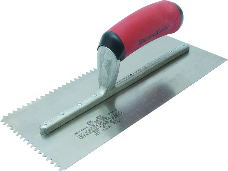 Die gezahnte Kelle von Marshalltown wird zum Verlegen von Fliesen, Teppichen und anderen Bodenbelägen, die mit Klebstoff oder Fliesenkleber bestrichen werden, verwendet. Durch die Zahnung und Größe der Kerben kann man die Menge des aufgetragenen Klebstoffs kontrollieren. Die Halterung aus Aluminiumguss ist fest vernietet an einem Blatt aus gehärtetem Stahl. Der widerstandsfähige Durasoft Griff bietet ein weiches Gefühl, mindert Ermüdungserscheinungen und bietet eine ausgezeichnete Haltbarkeit. Bei dieser Kelle sind zwei Seiten der Kelle gezahnt und zwei glatt und die Blattgrösse ist 279×114 mm.