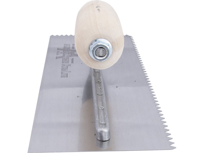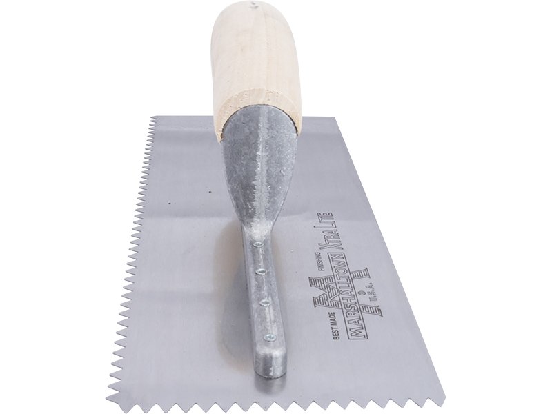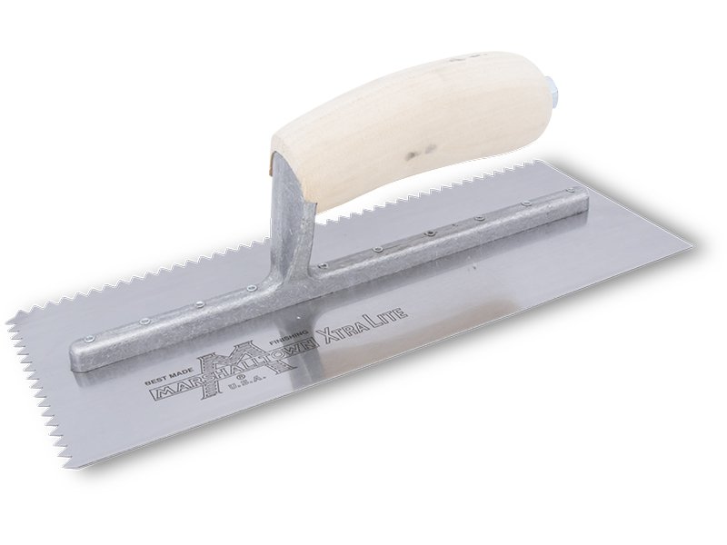 Die gezahnte Kelle von Marshalltown wird zum Verlegen von Fliesen, Teppichen und anderen Bodenbelägen, die mit Klebstoff oder Fliesenkleber bestrichen werden, verwendet. Durch die Zahnung und Größe der Kerben kann man die Menge des aufgetragenen Klebstoffs kontrollieren. Die Halterung aus Aluminiumguss ist fest vernietet an einem Blatt aus gehärtetem Stahl. Der Holzgriff bietet guten Komfort beim Arbeiten und ist pflegeleicht. Bei dieser Kelle sind zwei Seiten der Kelle gezahnt und zwei glatt und die Blattgrösse ist 279×114 mm.