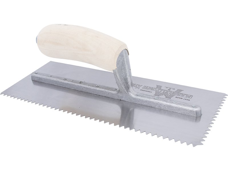 Die gezahnte Kelle von Marshalltown ermöglicht präzises Auftragen von Klebstoff für Fliesen und Bodenbeläge. Aluminiumguss-Halterung, gehärtetes Stahlblatt und robuster, gebogener Holzgriff. Größe: 279×114 mm, V 6×4,5 mm.