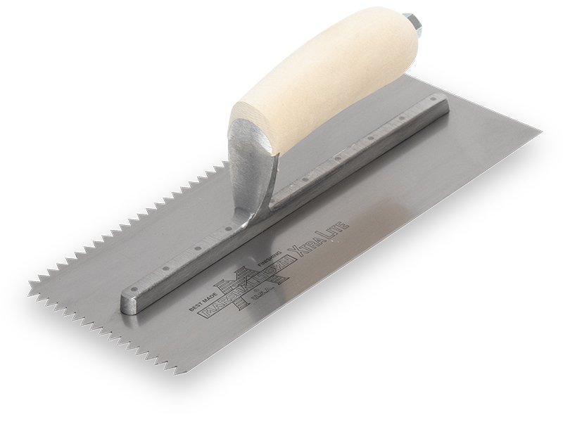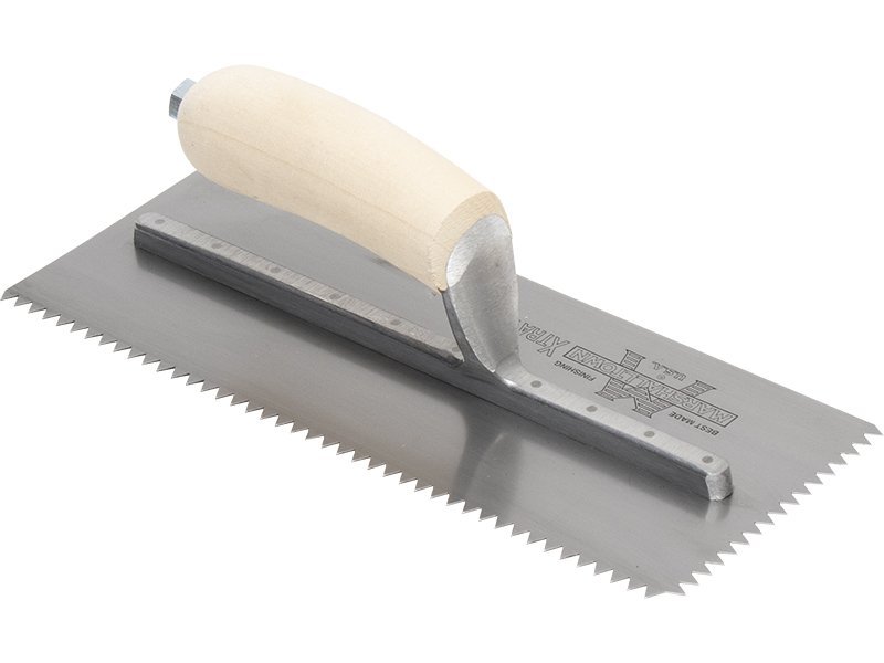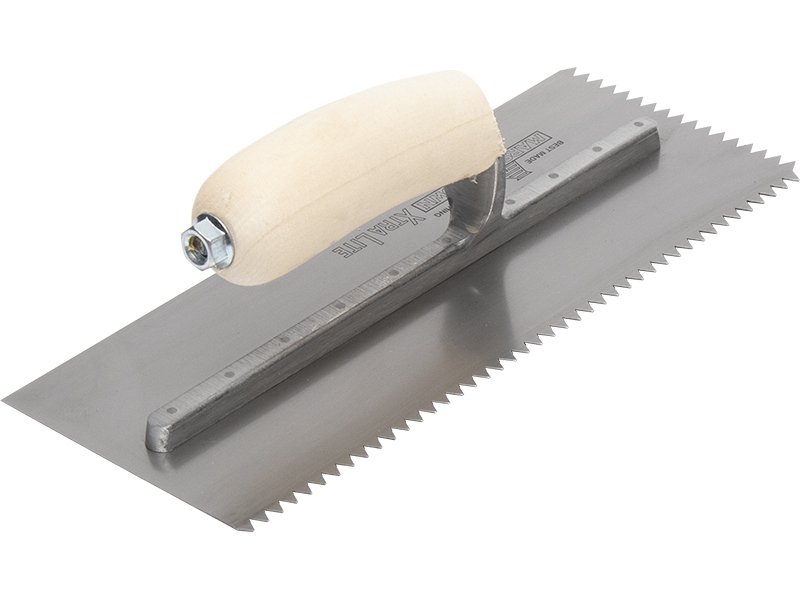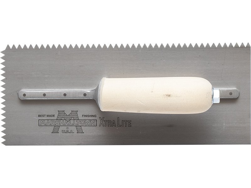 Die gezahnte Kelle von Marshalltown wird zum Verlegen von Fliesen, Teppichen und anderen Bodenbelägen, die mit Klebstoff oder Fliesenkleber bestrichen werden, verwendet. Durch die Zahnung und Größe der Kerben kann man die Menge des aufgetragenen Klebstoffs kontrollieren. Die Halterung aus Aluminiumguss ist fest vernietet an einem Blatt aus gehärtetem Stahl. Der Holzgriff bietet guten Komfort beim Arbeiten und ist pflegeleicht. Bei dieser Kelle sind zwei Seiten der Kelle gezahnt und zwei glatt und die Blattgrösse ist 279×114 mm.