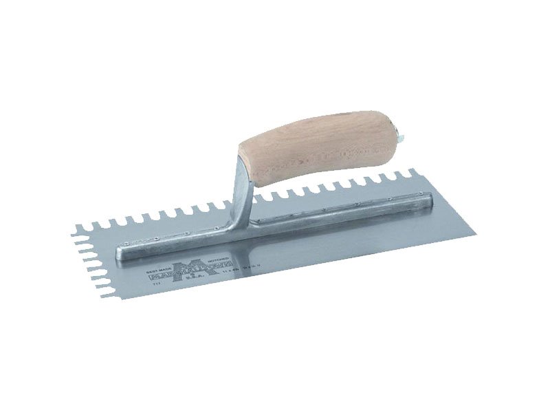 Die gezahnte Kelle von Marshalltown wird zum Verlegen von Fliesen, Teppichen und anderen Bodenbelägen, die mit Klebstoff oder Fliesenkleber bestrichen werden, verwendet. Durch die Zahnung und Größe der Kerben kann man die Menge des aufgetragenen Klebstoffs kontrollieren. Die Halterung aus Aluminiumguss ist fest vernietet an einem Blatt aus gehärtetem Stahl. Der Holzgriff bietet guten Komfort beim Arbeiten und ist pflegeleicht. Bei dieser Kelle sind zwei Seiten der Kelle gezahnt und zwei glatt und die Blattgrösse ist 279×114 mm.