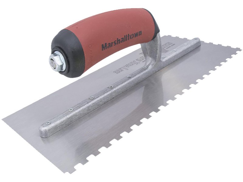 Die gezahnte und einseitig gekürzte Kelle von Marshalltown wird zum Verlegen von Fliesen, Teppichen und anderen Bodenbelägen, die mit Klebstoff oder Fliesenkleber bestrichen werden, verwendet. Durch die Zahnung und Größe der Kerben kann man die Menge des aufgetragenen Klebstoffs kontrollieren. Die Halterung aus Aluminiumguss ist fest vernietet an einem Blatt aus gehärtetem Stahl. Der widerstandsfähige Durasoft Griff bietet ein weiches Gefühl, mindert Ermüdungserscheinungen und bietet eine ausgezeichnete Haltbarkeit. Bei dieser Kelle sind zwei Seiten der Kelle gezahnt und zwei glatt und die Blattgrösse ist 279×114 mm.