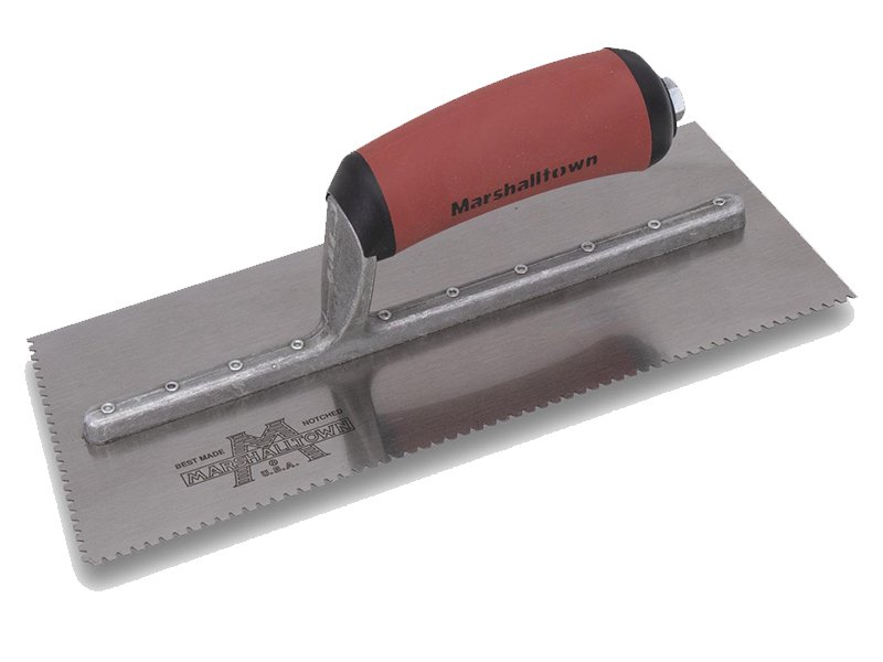 Die gezahnte Kelle von Marshalltown für Linkshänder wird zum Verlegen von Fliesen, Teppichen und anderen Bodenbelägen, die mit Klebstoff oder Fliesenkleber bestrichen werden, verwendet. Durch die Zahnung und Größe der Kerben kann man die Menge des aufgetragenen Klebstoffs kontrollieren. Die Halterung aus Aluminiumguss ist fest vernietet an einem Blatt aus gehärtetem Stahl. Der widerstandsfähige Durasoft Griff bietet ein weiches Gefühl, mindert Ermüdungserscheinungen und bietet eine ausgezeichnete Haltbarkeit. Bei dieser Kelle sind zwei Seiten der Kelle gezahnt und zwei glatt und die Blattgrösse ist 279×114 mm.