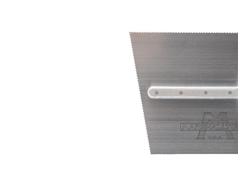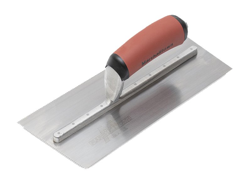 Die gezahnte und einseitig gekürzte Kelle von Marshalltown wird zum Verlegen von Fliesen, Teppichen und anderen Bodenbelägen, die mit Klebstoff oder Fliesenkleber bestrichen werden, verwendet. Durch die Zahnung und Größe der Kerben kann man die Menge des aufgetragenen Klebstoffs kontrollieren. Die Halterung aus Aluminiumguss ist fest vernietet an einem Blatt aus gehärtetem Stahl. Der widerstandsfähige Durasoft Griff bietet ein weiches Gefühl, mindert Ermüdungserscheinungen und bietet eine ausgezeichnete Haltbarkeit. Bei dieser Kelle sind zwei Seiten der Kelle gezahnt und zwei glatt und die Blattgrösse ist 279×114 mm.