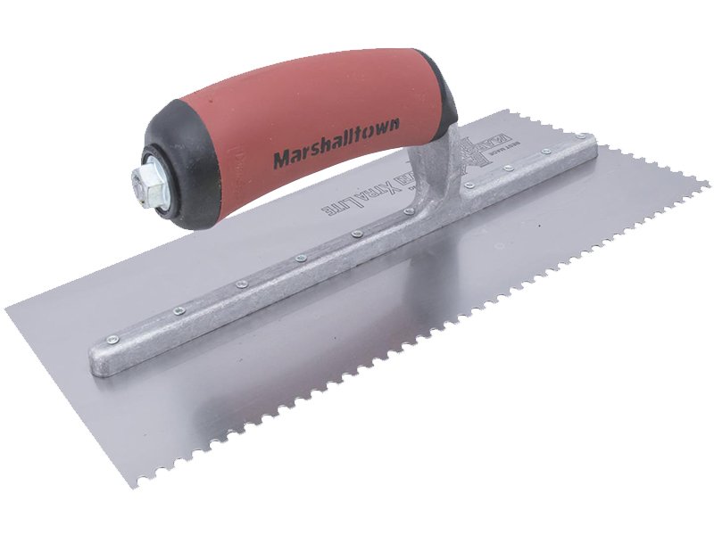Die gezahnte und einseitig gekürzte Kelle von Marshalltown wird zum Verlegen von Fliesen, Teppichen und anderen Bodenbelägen, die mit Klebstoff oder Fliesenkleber bestrichen werden, verwendet. Durch die Zahnung und Größe der Kerben kann man die Menge des aufgetragenen Klebstoffs kontrollieren. Die Halterung aus Aluminiumguss ist fest vernietet an einem Blatt aus gehärtetem Stahl. Der widerstandsfähige Durasoft Griff bietet ein weiches Gefühl, mindert Ermüdungserscheinungen und bietet eine ausgezeichnete Haltbarkeit. Bei dieser Kelle sind zwei Seiten der Kelle gezahnt und zwei glatt und die Blattgrösse ist 279×114 mm.
