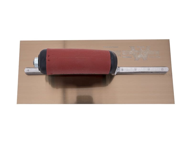 Marshalltown Glättkelle: Robustes Goldstahlblatt, fest mit Aluminiumgusshalterung verbunden. Dicke erste Niete für Belastbarkeit. Patentierter Durasoftgriff für Komfort. Austauschbarer Griff. Maße: 267×114 mm.