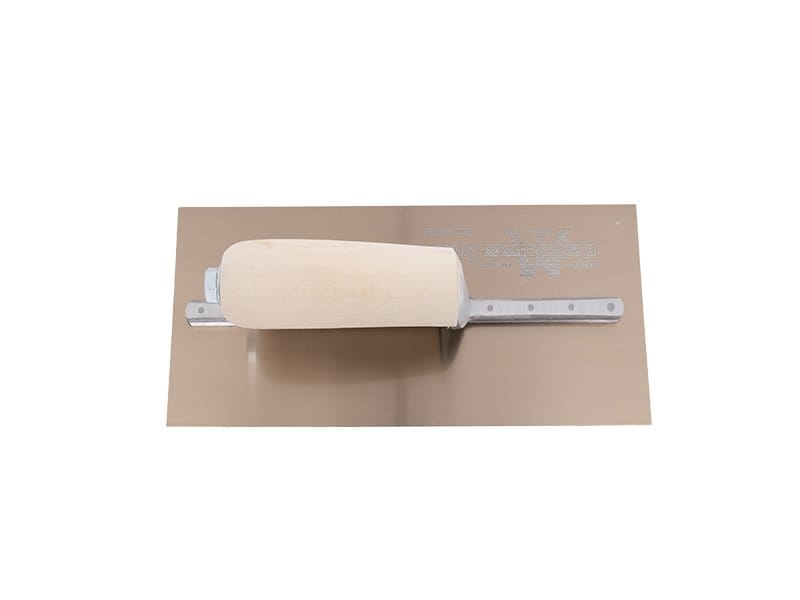 Marshalltown Glättkelle: Robustes Goldstahlblatt, fest mit Aluminiumgusshalterung verbunden. Dicke erste Niete für Belastbarkeit. Gebogener Holzgriff für Komfort. Austauschbarer Griff. Maße: 292×114 mm.