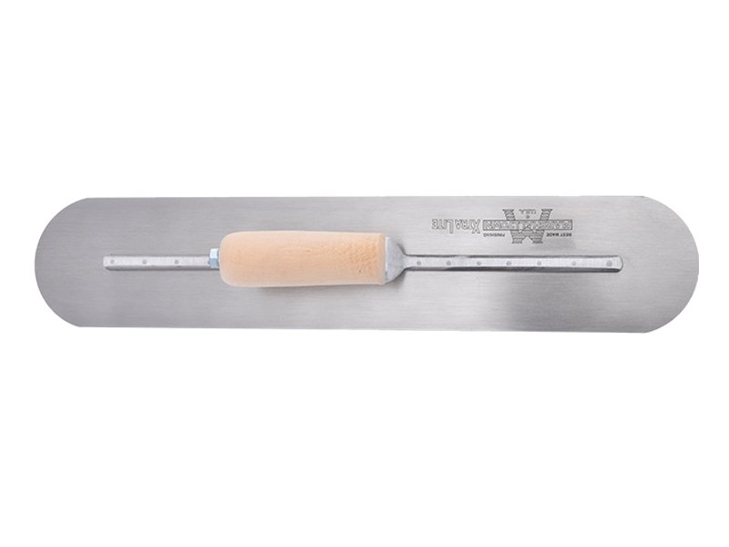 Hochwertige Glättkelle aus Carbonstahl mit fest verbundenem Blatt und abgerundeten Enden. Perfekt zum Nivellieren und Veredeln von Oberflächen. Ergonomischer Holzgriff für komfortables Arbeiten. Maße: 508×102 mm.