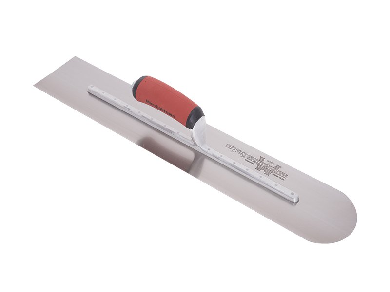 Hochwertige Glättkelle aus Carbonstahl mit abgerundetem vorderem Teil, fest verbundenem Carbonstahlblatt und patentiertem Durasoftgriff. Maße: 356×102 mm.