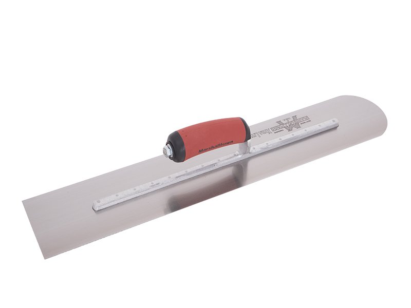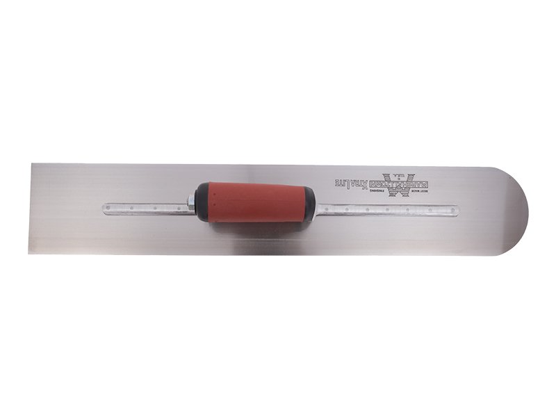Hochwertige Glättkelle aus Carbonstahl mit abgerundetem vorderem Teil, fest verbundenem Carbonstahlblatt und patentiertem Durasoftgriff. Maße: 406×102 mm.