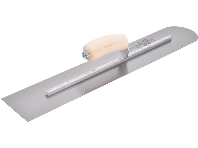 Hochwertige Glättkelle aus Carbonstahl mit abgerundetem vorderem Teil, fest verbundenem Carbonstahlblatt und belastbarem Holzgriff. Maße: 508×127 mm.